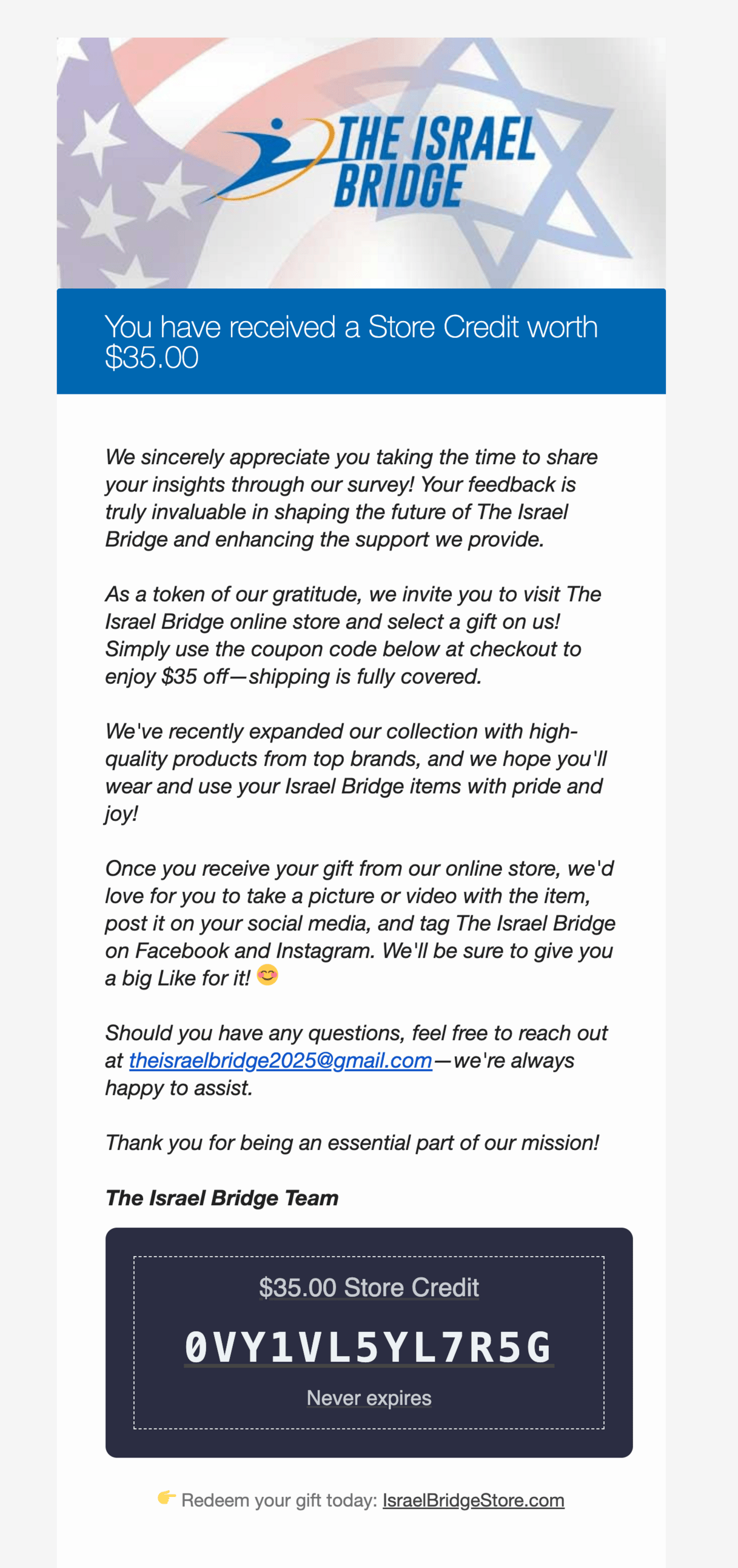 Each respondent received a personalized $35 store credit redeemable at The Israel Bridge's custom online store, featuring high-quality branded merchandise from premium suppliers. The digital reward cards included custom branded messaging that reinforced their mission and encouraged social media sharing.
