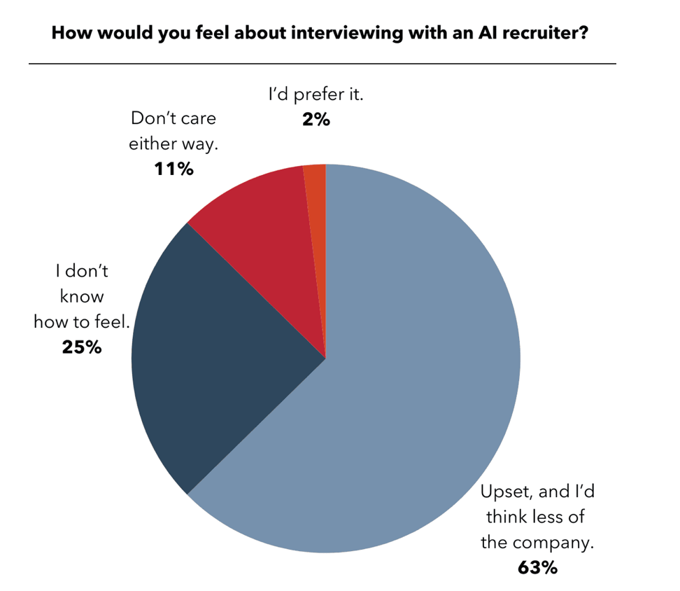 🤖 The AI Interview Dilemma: Only 2% Would Choose AI Recruiters & 63% would think less of companies, despite the potential benefits such as eliminating bias.
